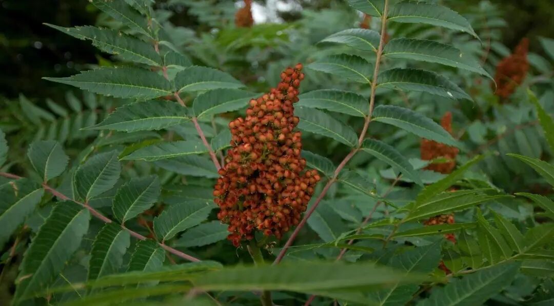 但是盐肤木果实是可以吃的,是咸咸的,而漆树的果实是不能食用,像这个漆树的果实,它可以提炼植物油,它的油在工业方面也起到了巨大的贡献,而且还是一种非常好的中药材,这种漆树,很多人看到它,触碰到它都会中毒,留下阴影。
