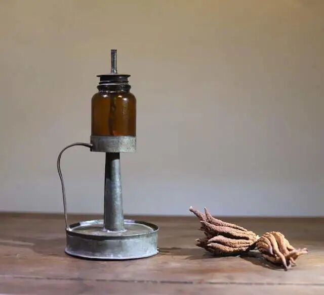 因此,那个时候,煤油灯的形状样式也有很多,记得那时母亲用我们吃的罐头瓶子来制作煤油灯,瓶口用一根铁丝拴住,用牙膏皮那个口子,装上灯芯,灯芯就是用棉花搓成一条绳子样的长条,从牙膏口穿过当灯芯,倒煤油进罐头瓶里面,就可以点亮了。
