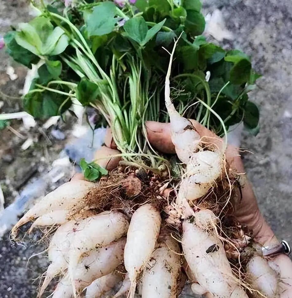 它有一植物特性,就是每一个枝干只长三片叶子,这个叶子也很有个性,就像爱心形状一样。其实主要的价值就是体现在它的根部了,记得小的时候没有零食吃,经常去采挖来当零食吃,现在把它挖起来。