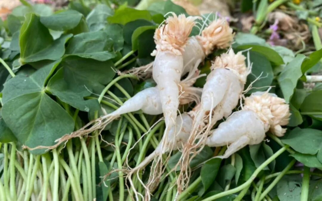 这个就是他的头部了,然后一直长,长到尾端的时候就会开枝散叶出来。它的头部又像我们农村的白萝卜,等一下我去清洗干净给大家看一下。