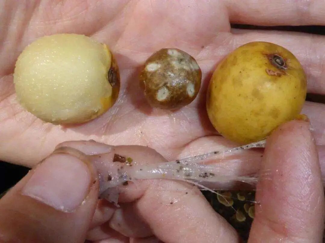 果实也是一种药材,这样黄色的去皮以后就可以直接吃,绿色的就要放一段时间再吃,剥开了它这个外面的硬皮以后,我们就可以看到它里头这个晶莹剔透的白色果肉了,软滑粘稠的果胶紧紧包裹着这个丝丝缕缕的果肉纤维,纤维又紧紧的粘粘着这个果核,因为它这种粘滑的质感,它还有一个很有意思的别名叫鼻涕果。