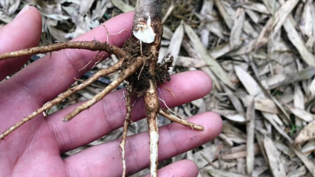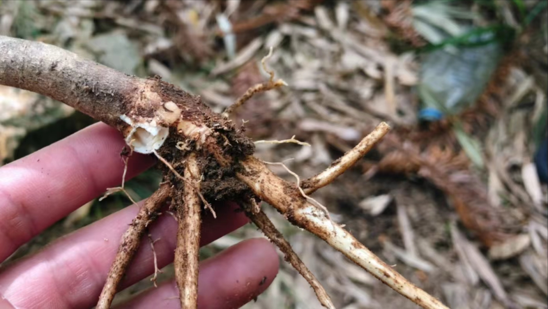 你看它底下的根就长这样子,在中医上它的根、叶子以及它的茎都是可以做药用。树参为民间草药,根、茎、叶治偏头痛、风湿痹痛等症。