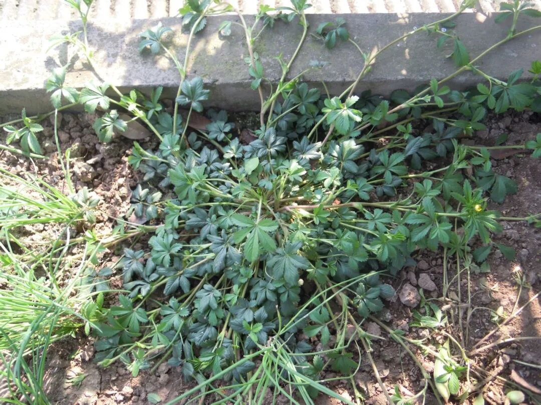 像这种植物在我们当地就称之为止咳草,别名也称之为五皮风,蛇含萎陵菜,是蔷薇科委陵菜属植物,一年生、二年生或多年生宿根草本,它的枝杆成圆柱体,表面光滑无毛,呈紫红色,铺在地面上匍匐生长,多须根。花茎上升或匍匐,常于节处生根并发育出新植株,长10-50厘米,被疏柔毛或开展长柔毛。聚伞花序密集枝顶如假伞形,花梗长1-1.5厘米,密被开展长柔毛,下有茎生叶如苞片状。瘦果近圆形,一面稍平,直径约0.5毫米,具皱纹。花果期4-9月。