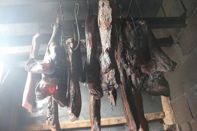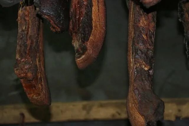 熏制好的柴火腊肉金黄剔透、香味纯正、肥而不腻,让人垂涎欲滴,吃上一嘴,便马上感到一种浓浓郁郁、香香醇醇、滋滋润润的鲜美荡气回肠。猪脚,猪耳朵,猪头都可以腌制熏烤的。