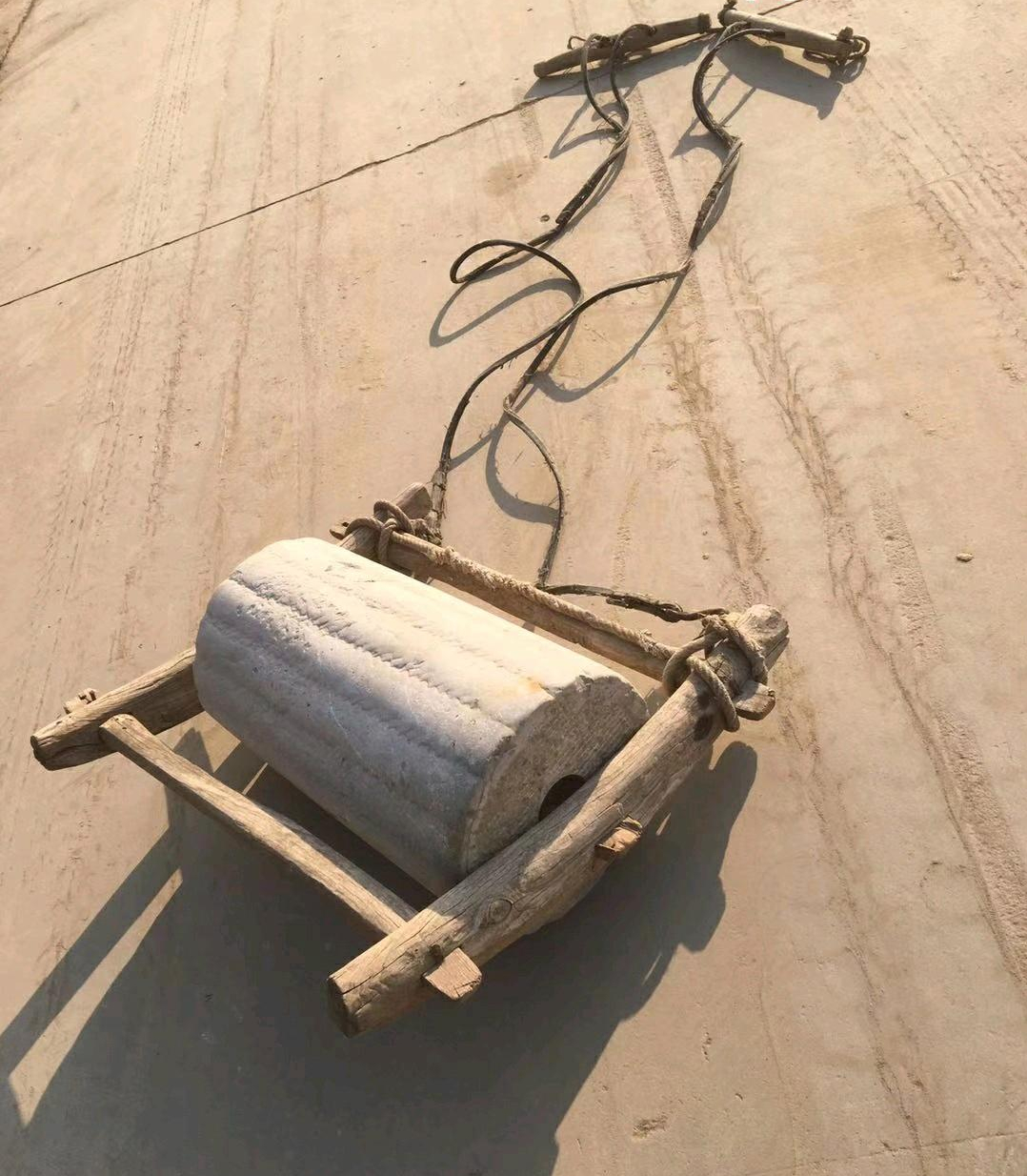 石滚是用大块的石头打磨成的。它的四周加上木架子方便使用。在稻谷丰收的季节,这个石滚就起到了很大的作用。