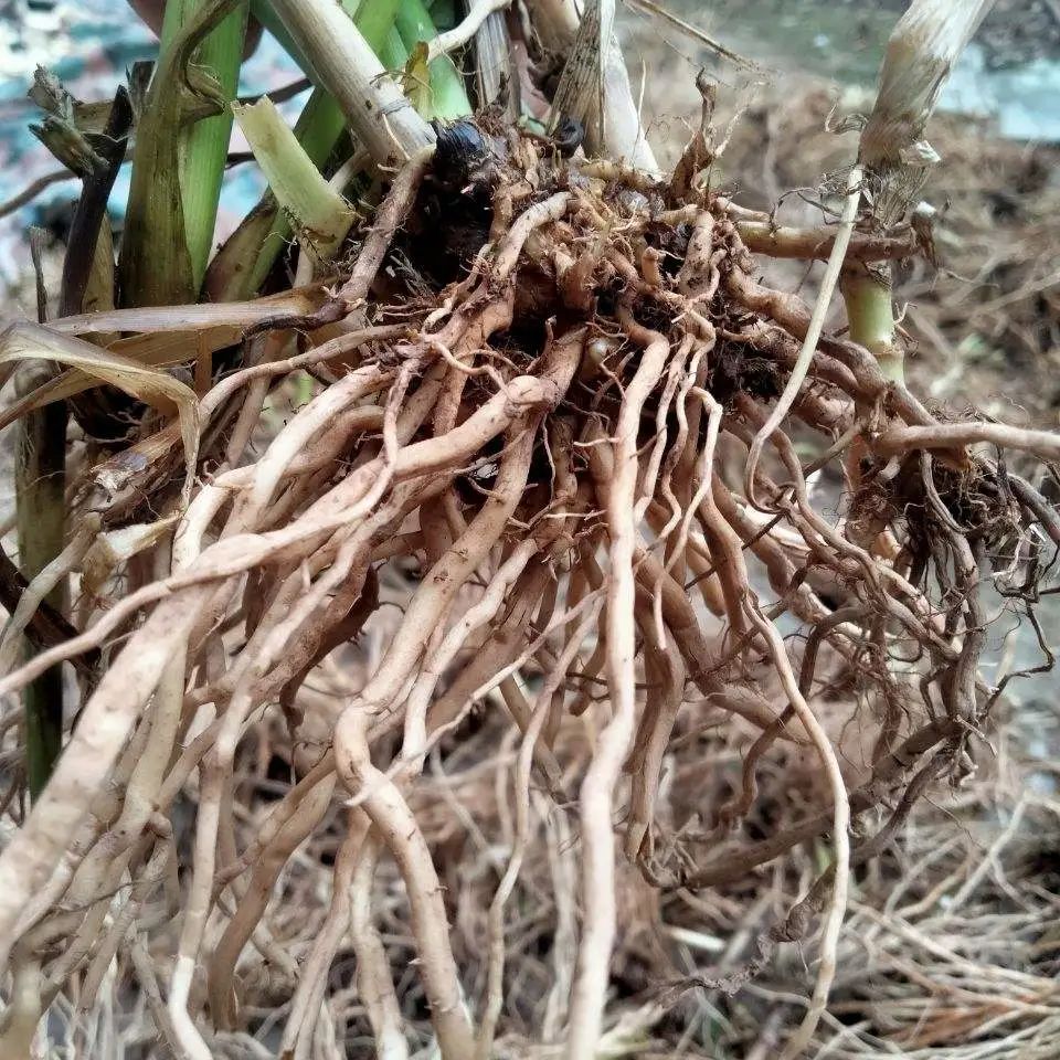 这一株挂果量确确实实还是蛮多的,有金黄色的,也有绿色的。然后它的梗看上去有点像玉米的梗,其实它的根部也是非常的神奇,等一下我拔一株起来给朋友们来看一下。