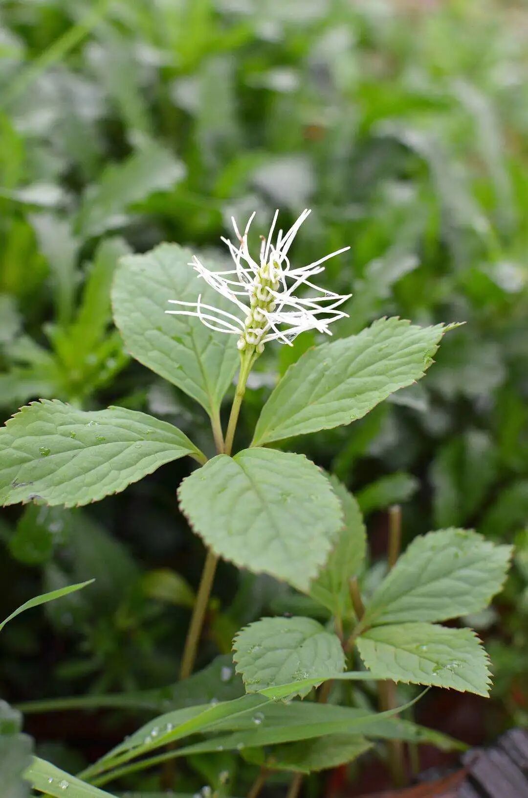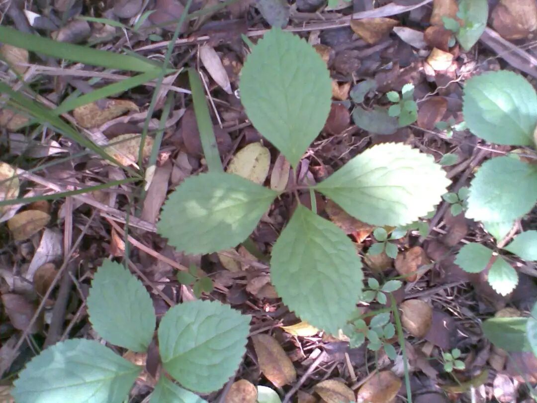 在这个比较滋润的田埂上面,就发现非常多出我们今天要介绍的宝贝,你看它的根茎是直立上来的,这种是属于多年生的草本植物,它在茎的末端的就长了有四片叶子,是这样子两片两片互生的,而且我们可以看到它的叶片是椭圆形,边边有这种锯齿,到叶片的边缘末端是这种尖一点的,是非常与众不同的,而且它的一个纹路看得非常的清晰,到它叶片的中心点,这里有点淡淡的紫色,看起来是不是非常的与众不同。