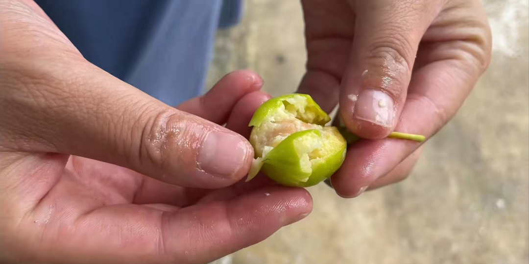 听老乡说啊,这种果实都是卖的非常贵的,要20块钱一斤。也不知道是不是真的,我们剥开来给大家看一下,里面有一个非常大的籽,就像枇杷一样,有一颗好大的籽,好多这个汁水,它的果实就是这样子的。