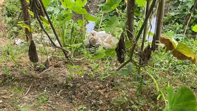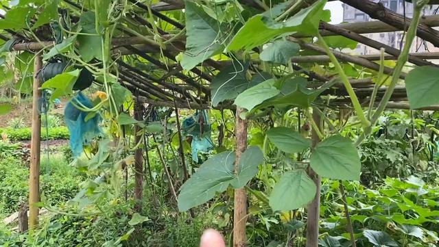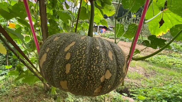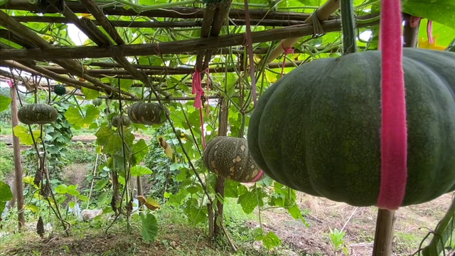 进来这边数了一下,总共结出来的果实大大小小就有30个,总共有两颗,一颗就有15个,这样平均下来,前面那里还有其他老乡家种植这个南瓜,我们去看一下那个产量,跟这个真的是没法比。