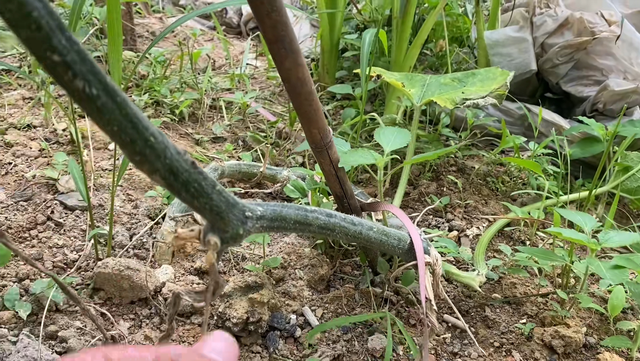 在这个位置它只种了有两颗,但是听她们说这两颗总共果实现在结出来就有二三十个,看一下它的根部,非常的粗大。这里有一颗,然后这边也有一颗,比我的拇指都粗了。