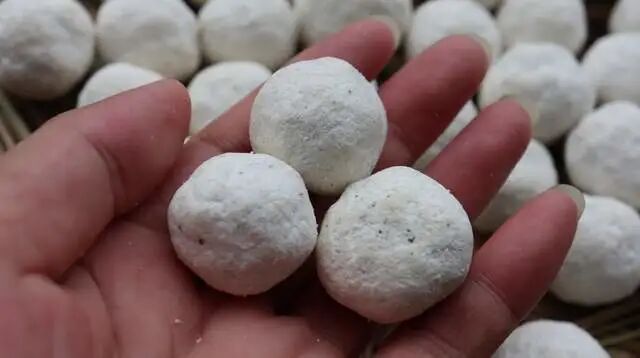 然后把它晒干就是酒曲了,这种酒曲在小吴的家乡湖南新化农村卖50块钱一斤,因为在我们那边到了重阳节以后,很多农村家里面就会蒸糯米酒了,就要用到这种酒曲,所以它的价格还算比较高的,但是这样的价格还是供不应求,因为在农村里面蒸米酒的人比较多,再加上这种手工制作的酒曲数量也不多,做不了多少。