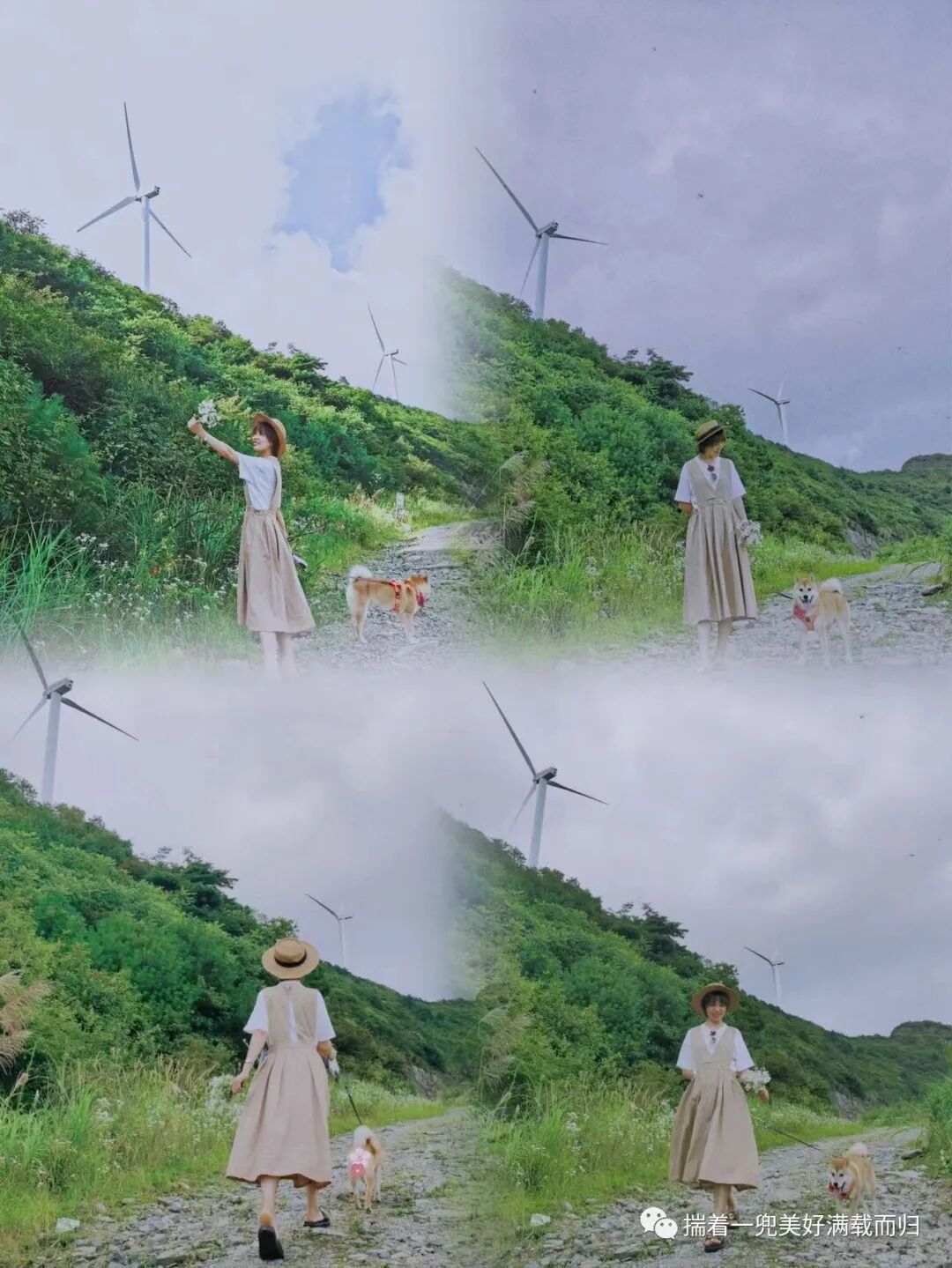 第二天早上实在不想早起看日出,睡到自然醒,带豌豆出去上厕所,被外面的风景惊艳了,日出后刚刚散开的雾气悬浮在风车周边,空气清新、晨风温柔;本来想爬到酒店后面的山顶近距离看风车的,但是担心豌豆的腿不能爬太久楼梯就作罢了;小红书搜一搜发现还有这里还有个石龙峡景区,可以溯溪,于是直奔目的地;