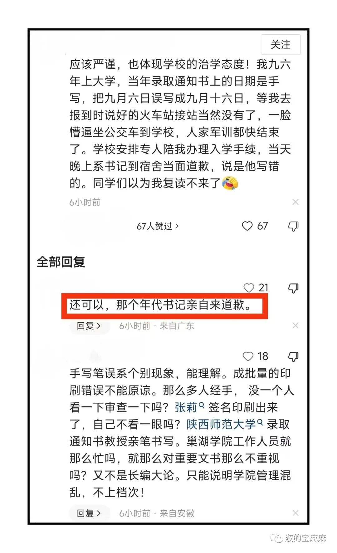 有网友分享了他也曾有过录取通知书出现失误的遭遇,当年录取通知书也是把日期写错了,不过没有巢湖学院这么离谱,后来系里的书记还专门到宿舍当面道歉。