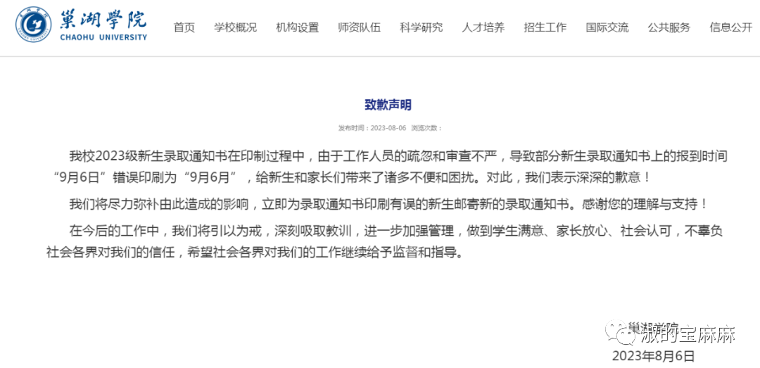 针对新生录取通知书上出现的错别字,巢湖学院官网刊出一则致歉声明:新生录取通知书出现错字系工作人员疏忽和审查不严,给新生和家长们带来了诸多不便和困扰。