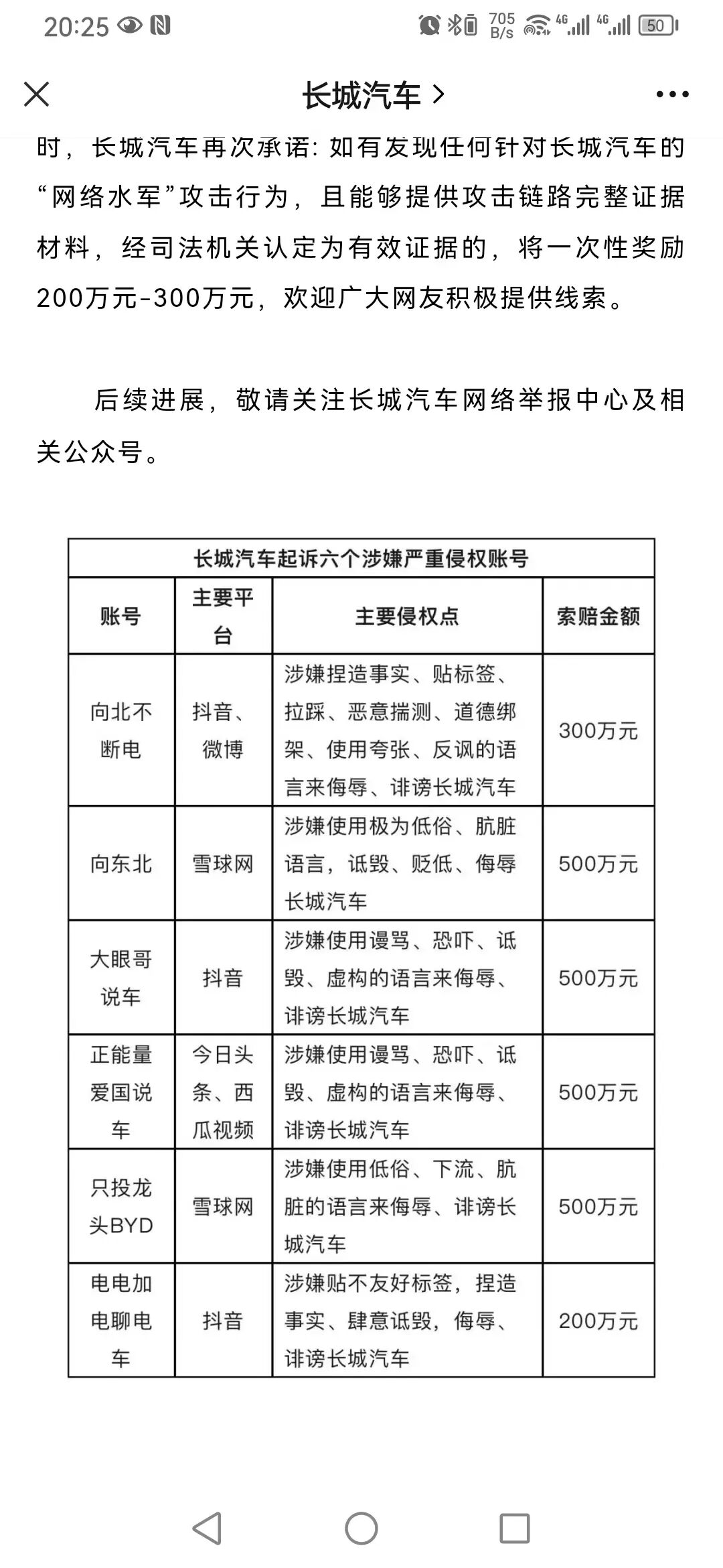 长城汽车同样也对一些大V进行了起诉,索赔金额从200万到500万不等!