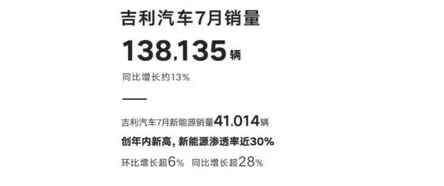 吉利汽车7月份卖出去了13万多辆,表现还是一如既往的稳定,并且7月份吉利汽车新能源销量表现亮眼,卖了4万多辆。