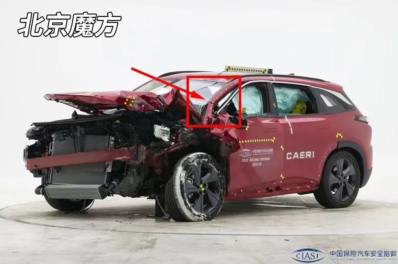 第三款车北京魔方,相较于比亚迪护卫舰07和奥迪A4L的变形,北京魔方A柱是出现了明显的弯折的,本来这车就卖的不好,一个月就卖几百辆,这次碰撞结果公布之后估计几百辆也卖不出去了!