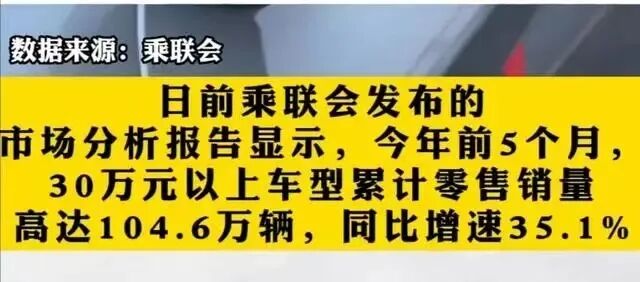 近日乘联会发布市场分析报告显示,今年前5个月,30万元以上车型累计零售销量高达104.6万辆,同比增速35.1%。作为对比,30万元以下车型累计销量658.7万辆,同比增速只有0.5%。也就是说,每7个人就有一人购买30万元以上的汽车。是不是发现有钱人是真的多呢,买一辆30万以上的车就跟买菜一样呢!