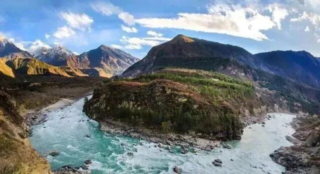 不过要说墨脱最有名的景点,还得是那雅鲁藏布江大峡谷跟南迦巴瓦峰。雅鲁藏布江发源与喜马拉雅山北麓的杰马央宗冰川,流淌在青藏高原横行无忌,切割出了一条长504千米的巨大峡谷,但当它遇到海拔7782米的南迦巴瓦峰,还会选择拐了个弯,形成了壮丽的雅鲁藏布江峡谷大拐弯。