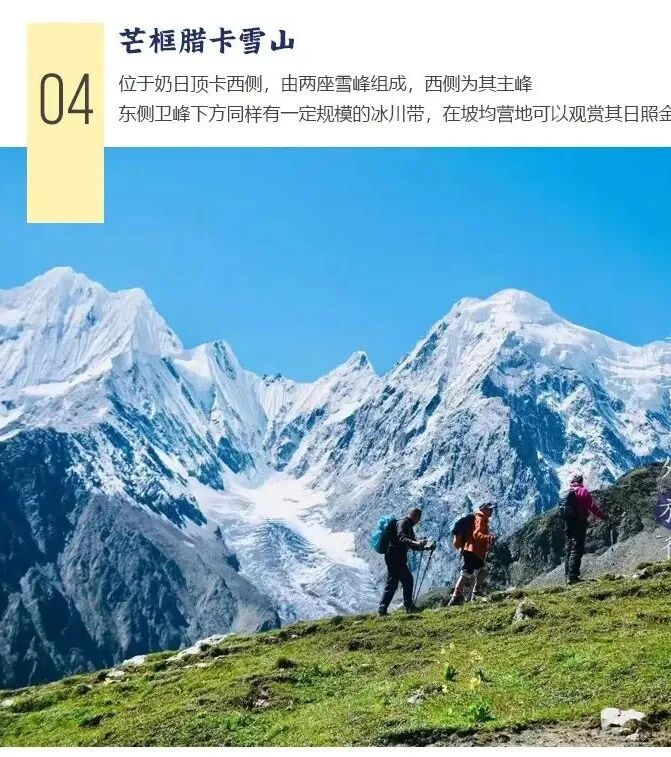 早上八点吃完早餐,收拾完装备从竹林营地出发。沿着河谷前进,穿过一个大约3公里左右的原始森林路段后,梅里雪山北坡主要山峰群就已经展现在眼前,再经过一个废旧牛场,越过木桥,爬上山坡,奶日顶卡及其衍生冰川迎面而来。向着雪山继续前进,很快便可到达坡均营地(海拔4100米)。营地正面就是梅里雪山北坡,奶日顶卡冰川、来日贡卡、奶日顶卡、芒框腊卡等北坡主要山峰一览无余。雪山冰川、白云蓝天、河流草甸,还有悠然惬意的牦牛群,搭建好帐篷后,可以前往奶日贡卡冰川附近游玩拍照。今日全程无信号。