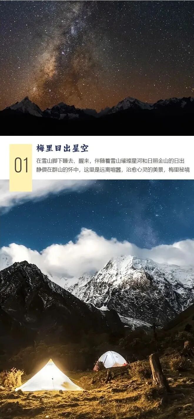 用餐后从飞来寺乘车出发,大约2小时左右到达亚贡村(海拔3000m),开始轻装徒步进山。在竹林和阔叶林的共生的山间小道上,沿着河谷两岸一路爬升,中间有数个碎石横切路段,中午在途中桥边简单路餐,大约5小时左右到达涨价营地(海拔3450米),可看见雪山。穿越密林和溪流,大约徒步1小时到达竹林营地,稍事休息后在领队的帮助下搭建帐篷和烹饪晚餐,晚饭后大家可以围着篝火聊天喝茶,我们为大家准备了露天电影,伴着雪山与江河观影,深夜在星空下入眠。今日后半程无信号。