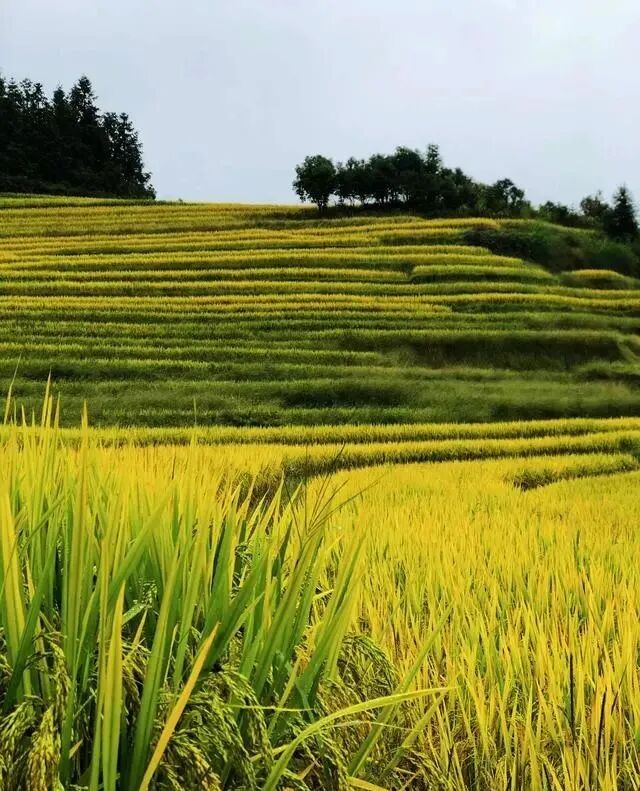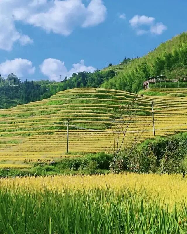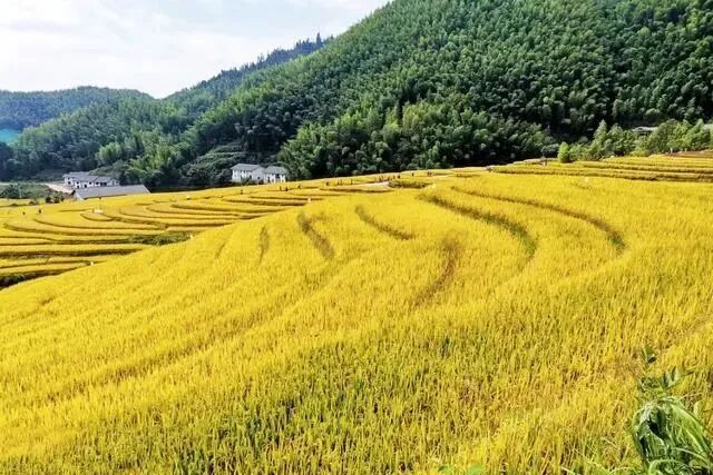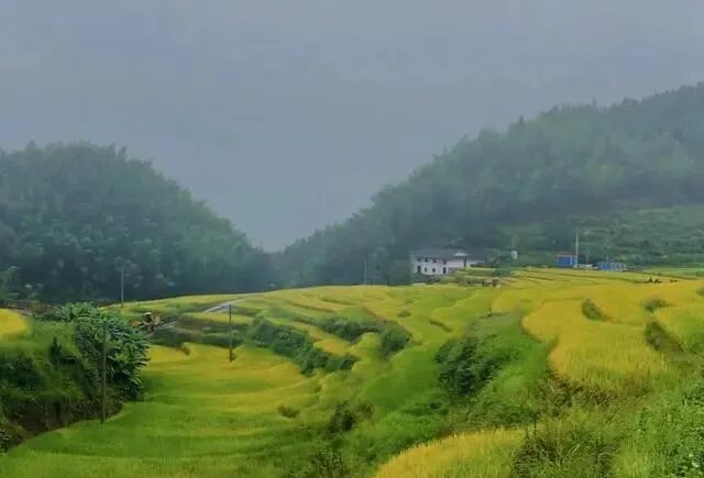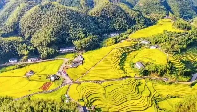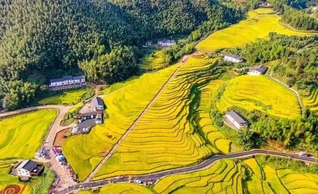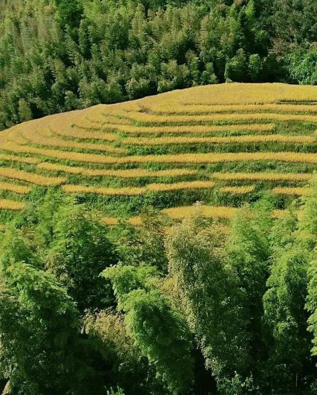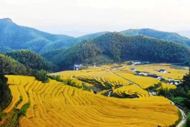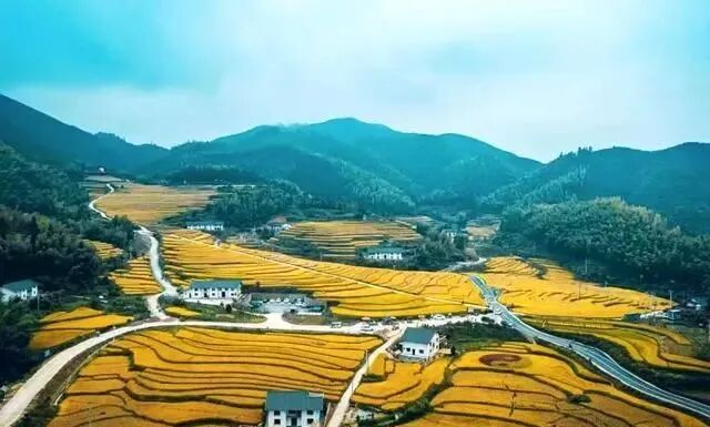 曲线内是一块块绚烂的金黄,从上到下,从远到近,就像是上帝散落的金缕,全然铺满了这片山间。