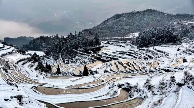 此时,空气清凉,柔雪浸染雾田野山间,秀了梯田,润了山林。