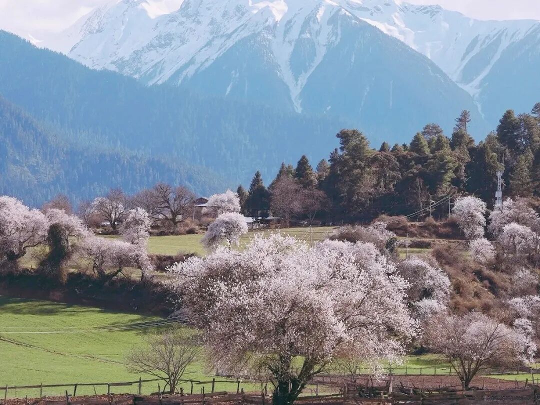 舒展着它对春日的向往与热情,绽放出万朵桃花摇曳枝头,如烟似霞,与远处的雪山山峦交相呼应 ,极尽浪漫与唯美,让游客直接住进如梦如幻的山水画卷中,被绝美春意所包围。