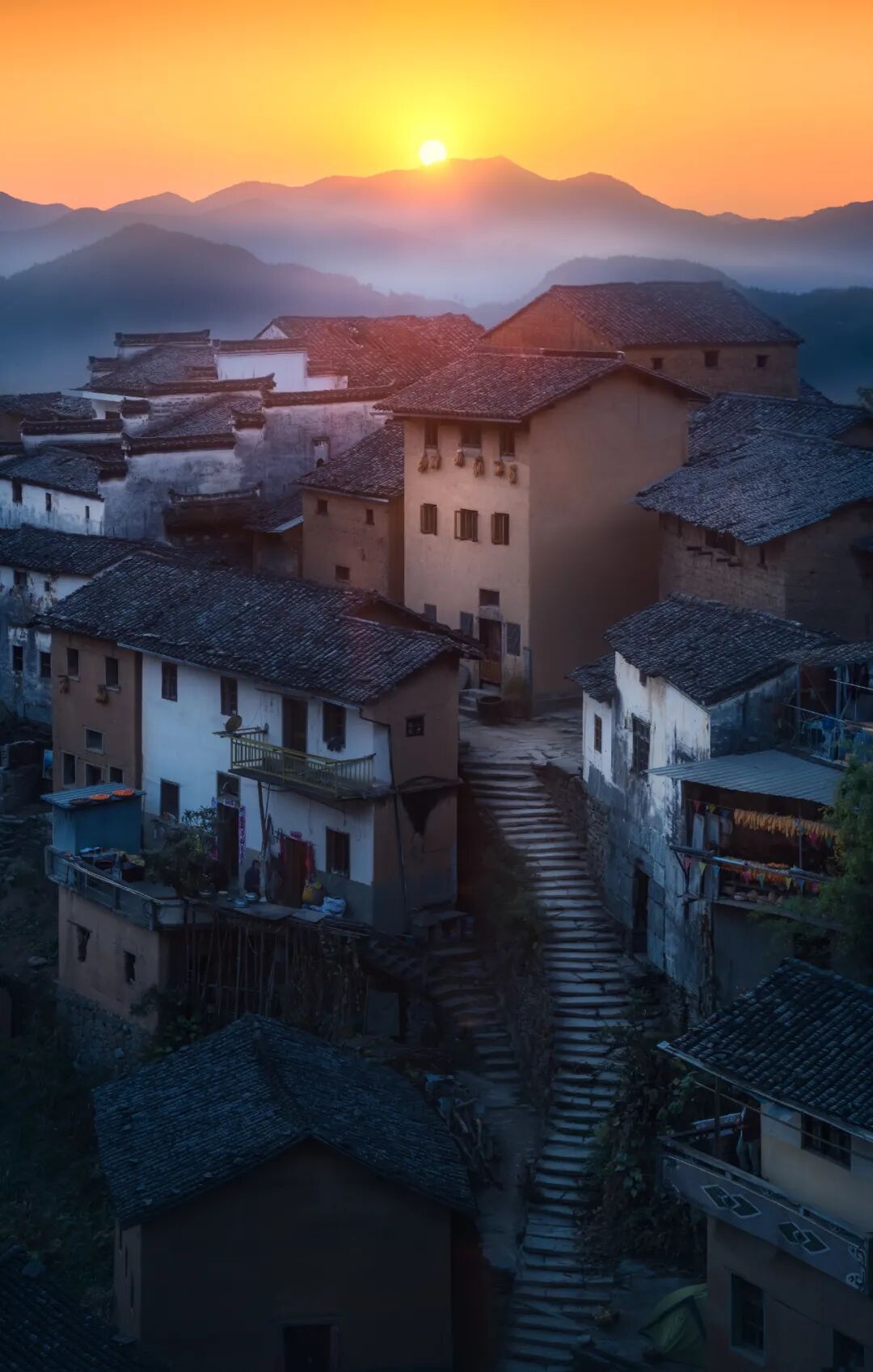 黄昏,绵长温暖的落日余晖从天边穿过火红的枫树,打在古朴典雅的徽式民居上。