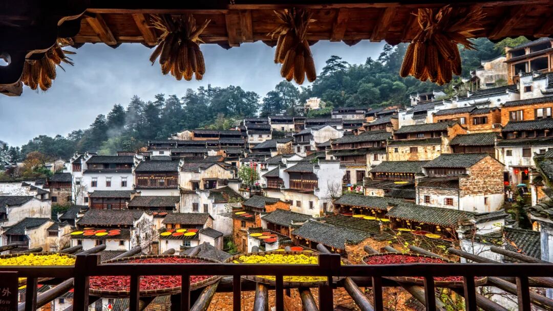篁岭古村距今有600多年历史,数百栋徽派古民居在百米落差的坡面错落有序,自然条件的局限造就了一处中国绝无仅有的“晒秋人家”风情画。