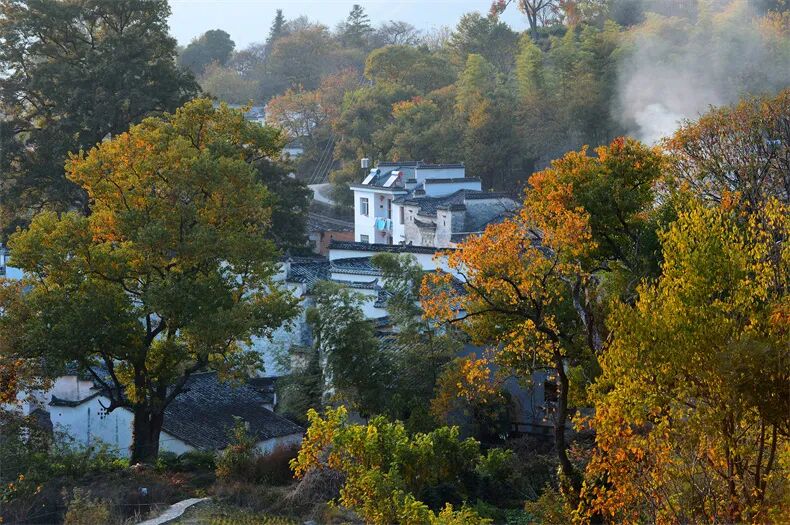 徽州,从10月中旬到11月下旬的这段时间,这里的秋叶,经过霜降,由绿变黄,由黄变红,美似一幅画。
