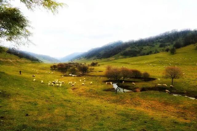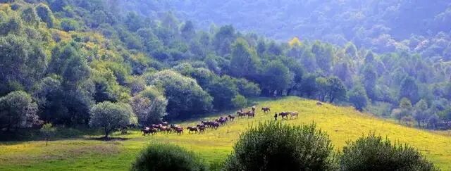 秋风吹过,草原变了色调,牛羊成群慢悠悠的走着,仿佛一幅天然的油画。绚烂的火红和金黄、深浅不一的棕和绿,层层叠叠,或迷人斑斓,或静谧清冷,或神秘莫测,给人以无限的遐想。