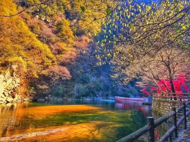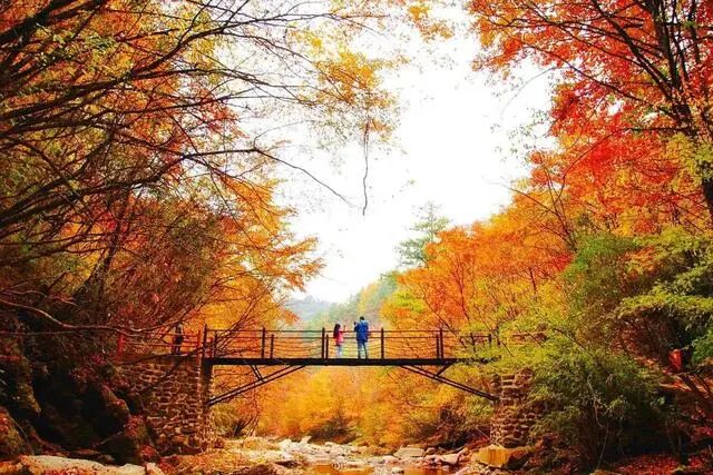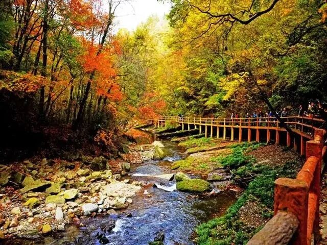 秋日里的陕西太平国家森林公园,雾气缭绕之下,树林被水汽洗涤得艳丽多彩;沿路的金色落叶与蓝天白云相称的红色林海。秦岭的秋色尽收眼底,每一步都有别样秋韵,每一处都是艳丽画作。