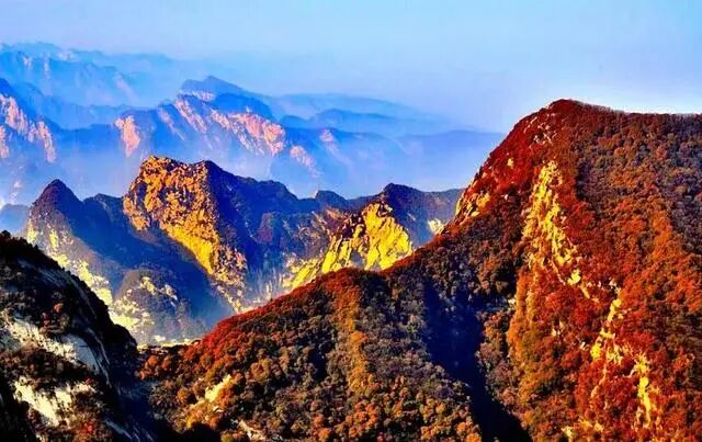 华山自古以来就有“奇险天下第一山”的说法。秋天的华山,温度适中,红叶满山,山崖为底,松桧为墨,是休闲旅游的最佳季节。秋风好比一支神奇的彩笔,肆意挥洒,将华山绘成了一幅灿烂的画卷。