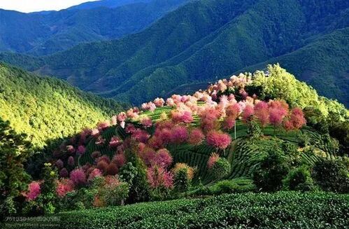 粉红色的花,白色的云雾,绿色的茶园……漫步在云雾缭绕的茶园,碧波翻滚的新绿映衬着如霞似火的粉色樱花,仿佛置身于油画之中!远远望去,一株株樱花与层层茶田相得益彰,谱写着绿茶红樱相恋相守的浪漫乐章。