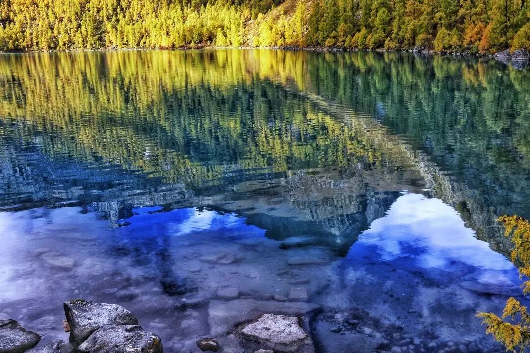 雅拉雪山雪线下是浩瀚稀有的红杉木原始森林,穿越线路中有大片大片的沙棘林带。山腰下有各具特色的雅拉友措(又叫玉石海,俗称小海子,海拔3980米),垭拉措和镇朗措(又名姐妹湖,俗称大海子,海拔4200米)三个高山海子。
