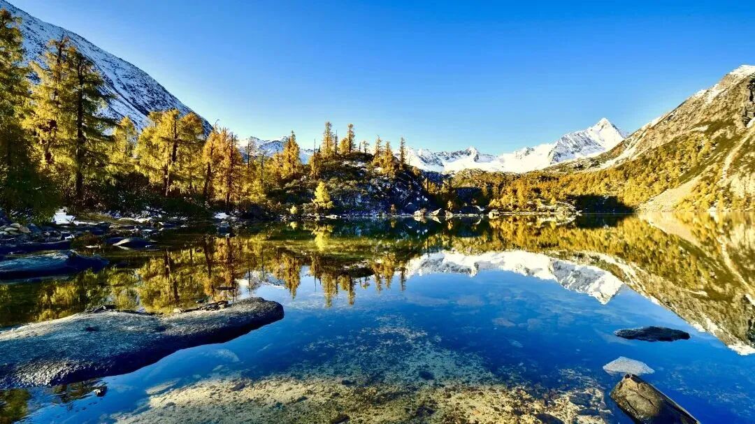 甲依拉措是一个雪山 、落叶松、杜鹃花怀抱的高山湖泊,与葫芦海为姊妹湖,隔山相望。湖边停留休息后我们开始沿河谷下撤回到公路旁返回党岭村。