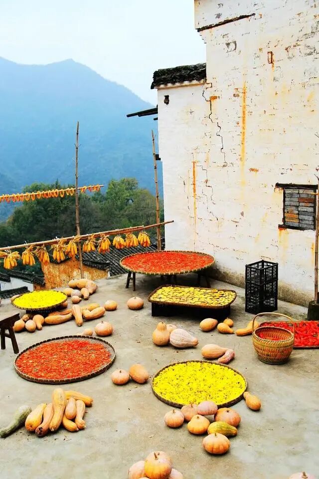 微风起,雾蒙蒙,走在青石板铺就的小巷里,古朴幽深,流连于白墙黛瓦间,诗情画意,或许这就是无数人追寻的另一种秋色。徽州秋色里的村落此刻正在经历晒秋,辣椒的红、南瓜的黄,各种颜色交织在一起,展现着惊人的生命力,白墙黛瓦为这些“拼接”在一起的色彩留白,寂静的氛围下又稍显热烈。