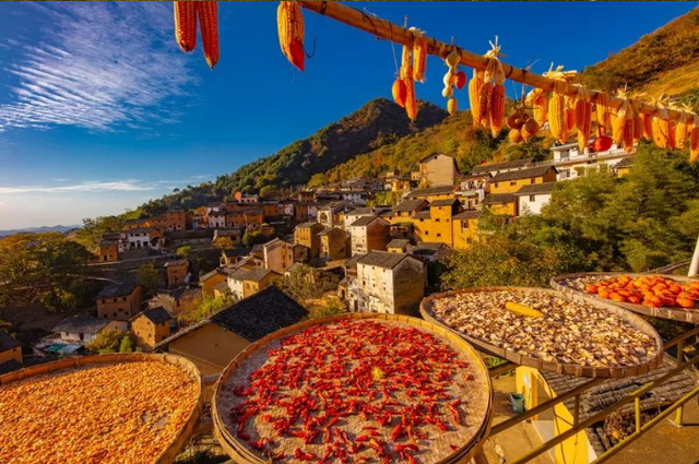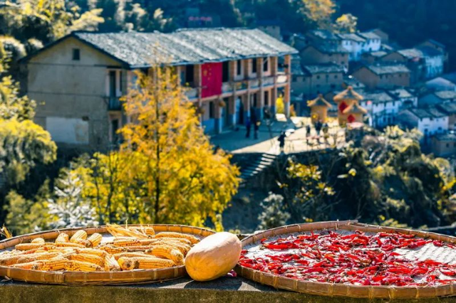 独具古韵的阁楼人家,登上眺望,便可看见多彩的农作物晒于用竹子编织而成的圆簸箕之上,一盘接一盘,便形成了传说中的晒秋盛景。