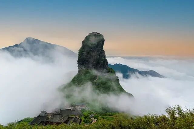 拥有着独特自然风光的梵净山,由三座山峰组成,每一座山峰都表现着它独特的自然气息,在这山峰上矗立着一座金鼎,在时间和风雨的侵袭下,坚硬的岩石也被这大自然的鬼斧神工分为了两半。