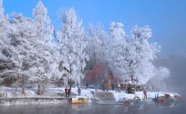 河面蒸腾的水汽在树上凝结成洁白的雾凇,仿佛是现实版的冰雪奇缘。伴随着移步易景的雪景,是难忘的体验。