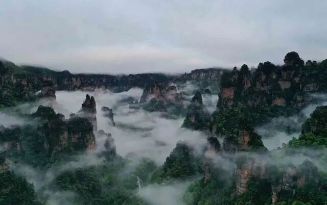 从空中俯瞰张家界,陡峭的岩峰耸立于沟壑深幽处,细长的溪流穿行于石林峡谷间,云雾时而从峡谷间溢出、时而漫上峰林之巅,宛若仙境一般。