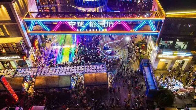 夜幕低垂,位于省会长沙的中建·梅澜坊街区,霓虹璀璨、车来人往。