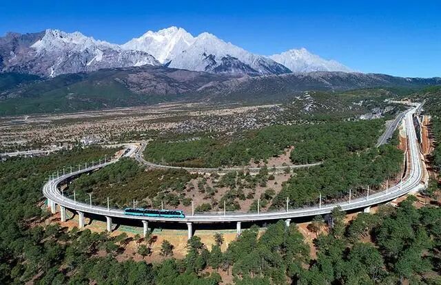 列车经过玉龙雪山脚下。丽江市委宣传部供图
