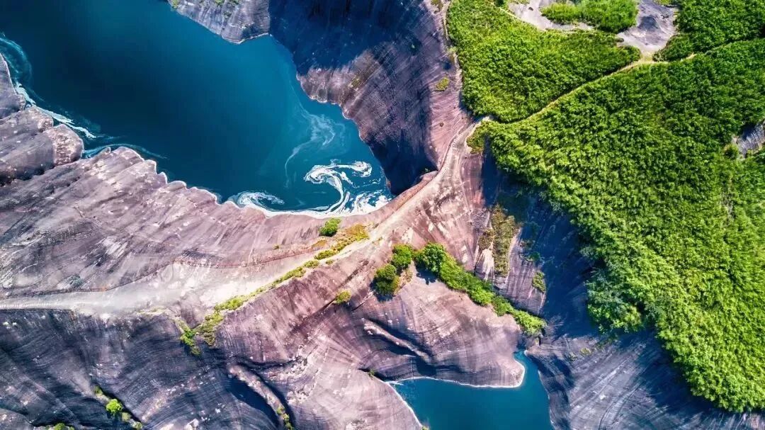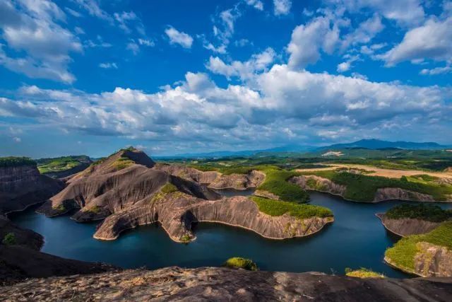 这里丹霞地貌与湖水相间交错,