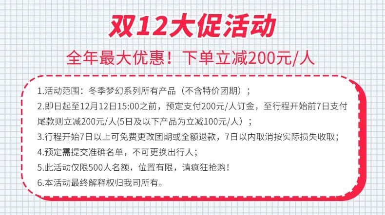 正价团期:成人4999元/人,儿童3399元/人,11月26日、12月3日、12月10日、12月17日、12月24日、1月1日、1月7日、1月14日、2月4日 、2月11日、2月18日(共十一期,四人报名可以任意时间独立发团)