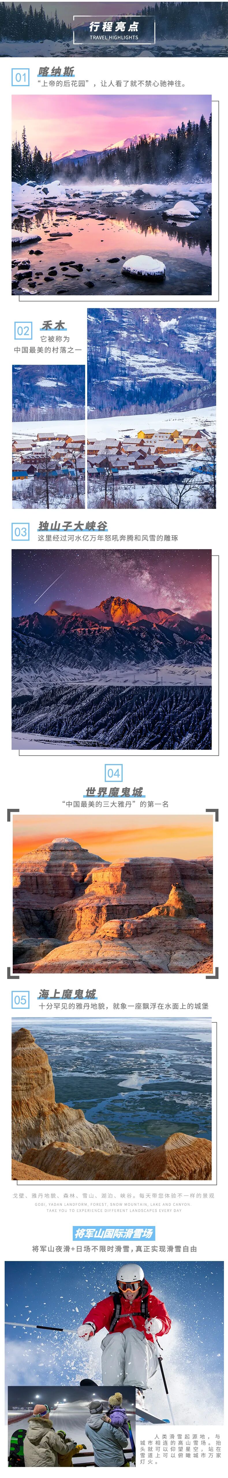 4、门票:乌尔禾魔鬼城门票+环保车,海上魔鬼城环保车,喀纳斯禾木冬季通票,将军山滑雪场夜滑+日场滑雪,包含雪鞋、雪板、雪杖使用;