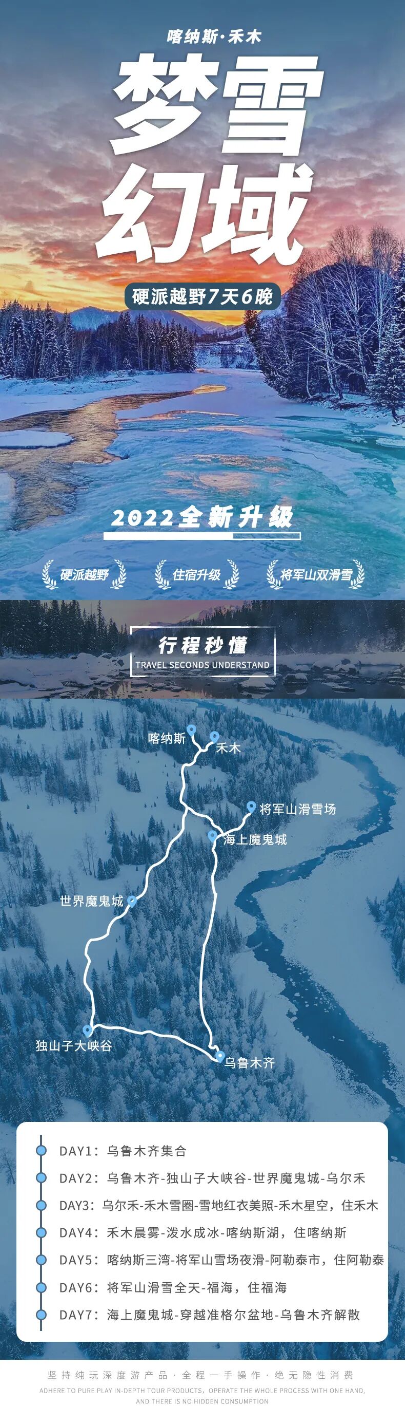 2. 由于禾木、喀纳斯景区要求吃住一体化,需在农家吃一顿正餐才含早餐,敬请谅解。