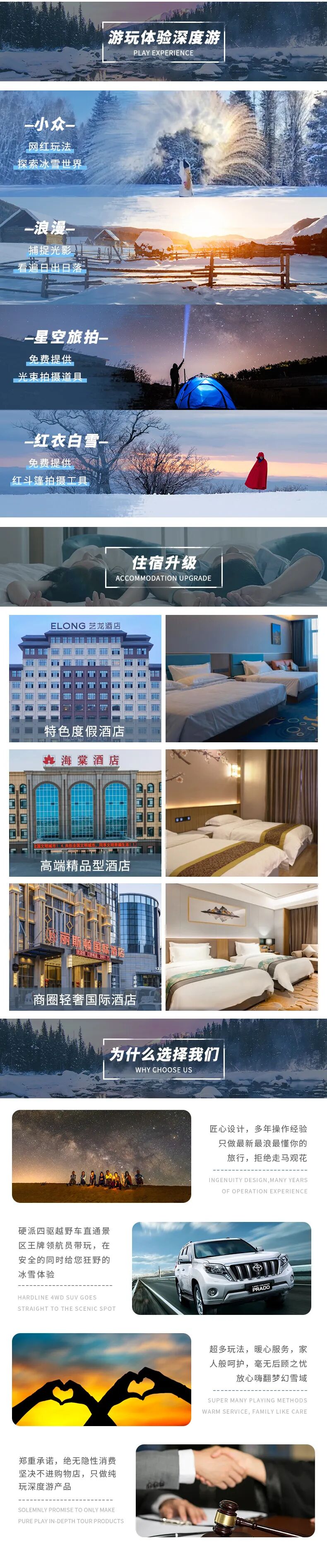 3.11月下旬到次年2月末为最冷季节,气温普遍零下10度-零下20度。一定要准备好保暖的衣物。日出时间为9点30,日落时间为18点30左右,大家掌握好游玩时间。