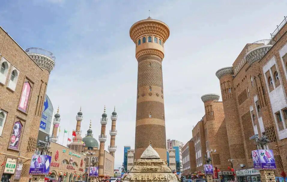 【国际大巴扎】——世界上规模最大的巴扎(巴扎为维吾尔语,意为集市)。具有浓郁的伊斯兰建筑风格,体现了浓郁的西域民族特色和地域文化,这里除了有令人眼花缭乱的商贸市场外,还有美食广场、观光清真寺、80米高的新疆第一观光塔等设施。